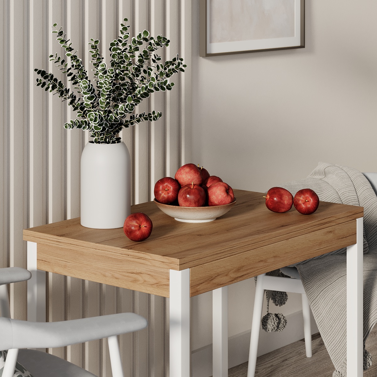 Stół rozkładany „Lunch” to idealne rozwiązanie dla osób, które cenią sobie nowoczesny design, oszczędność miejsca oraz maksymalną wygodę. W wersji złożonej jego wymiary wynoszą 90 × 60 × 76 cm, dzięki czemu zajmuje niewiele przestrzeni i świetnie sprawdza się w mniejszych mieszkaniach. Po rozłożeniu blat powiększa się do 90 × 120 cm, tworząc komfortową przestrzeń, przy której może zasiąść nawet 8 osób. To doskonały wybór, jeśli szukasz stołu kuchennego rozkładanego na rodzinne obiady, codzienne posiłki czy spotkania ze znajomymi.